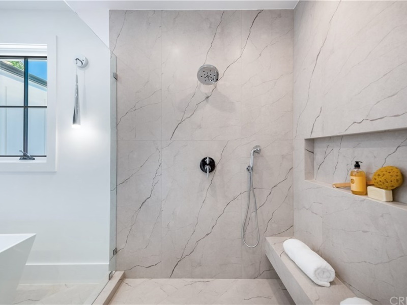 We custom built the upstairs bathroom giving the homeowner a walk-in shower with a complete granite and marble sitting bench to rest while bathing. Due to limitations, the homeowner cannot step into a shower and so we made sure the shower had an abundance of the room while in the water. We had special water faucets installed for him along with shelving for him to take and put back his shower accessories. Special toilets were installed along with lowered granite countertops for his special needs.