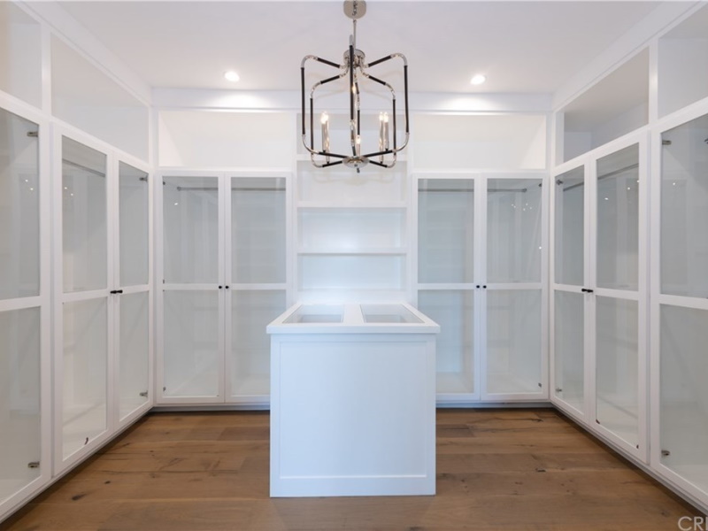 The upstairs closet is one you see on TV. A custom-built closet any celebrity would be completely jealous of. Due to the nature of this homeowner's business, we had glass panels installed along with an island in the middle of the area in which to house other personal effects. We also installed hidden cabinet locks that allowed others to view contents while on a closet tour, but with no access to open any of the cabinet doors.